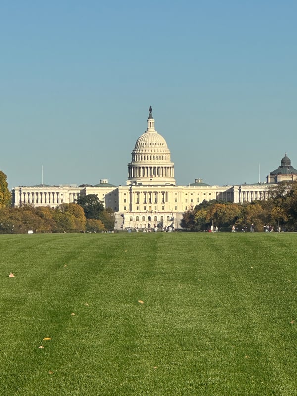 Dozens of volunteers pose in front of the US Capital building, holding up surfboards, the united oceans flag, and signs that say the seas are rising and so are we